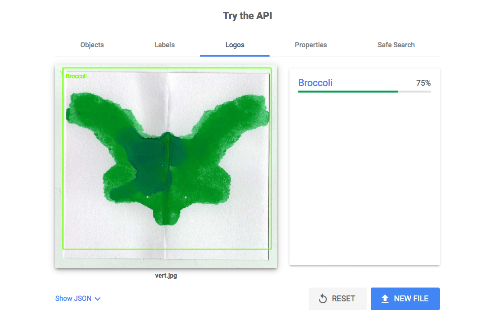 Cependant, Google Vision nous propose plusieurs catégories de réponses. On se retrouve alors pour la catégorie Logo avec un brocoli pour la tâche verte, le logo Lego pour la tâche bleue et enfin un produit de consommation pour la tâche rouge. Puisque changer ce paramètre a un impact sur le résultat obtenu, on peut en conclure que la couleur affecte l’interprétation de l’image.