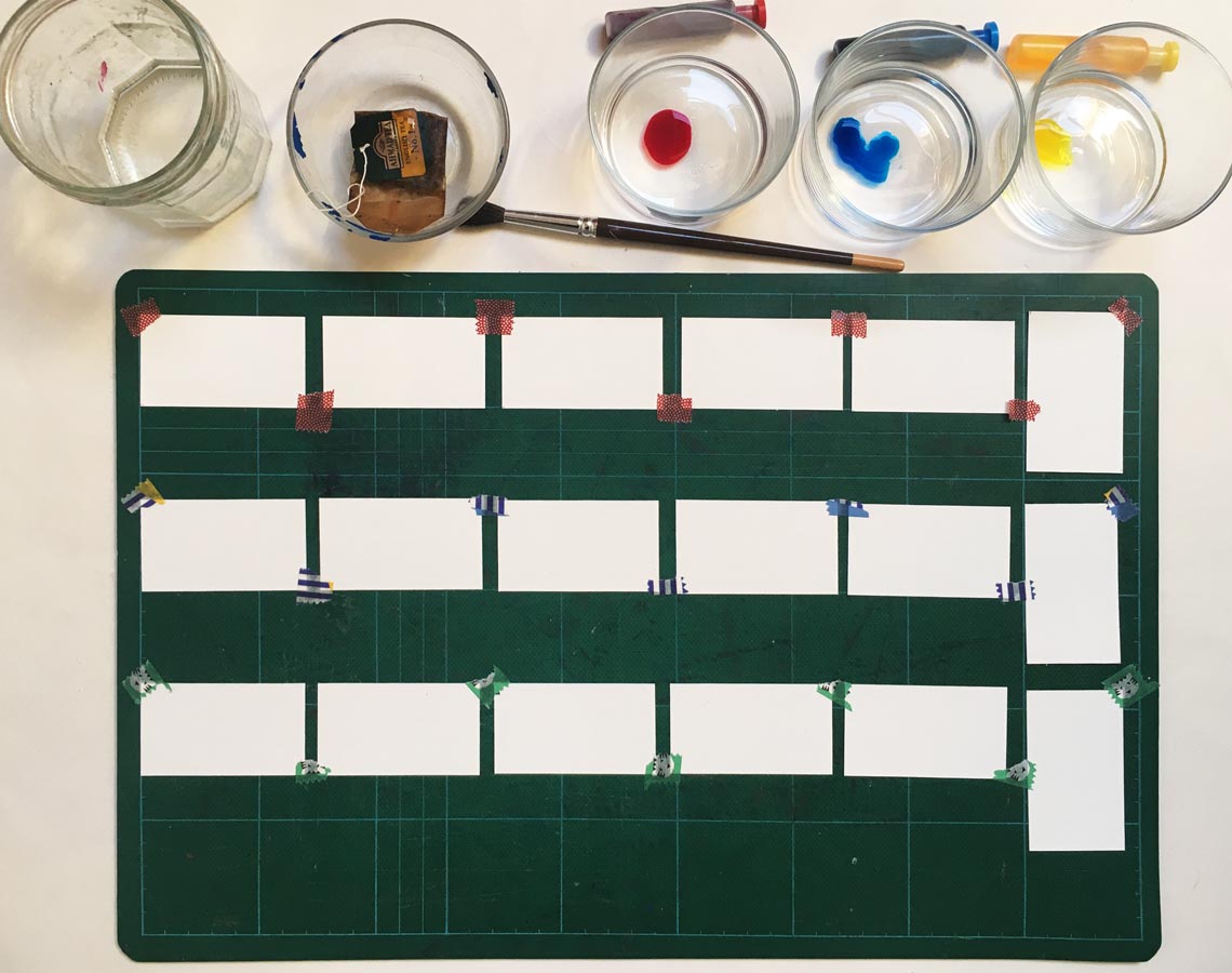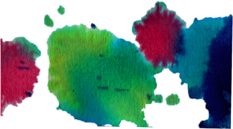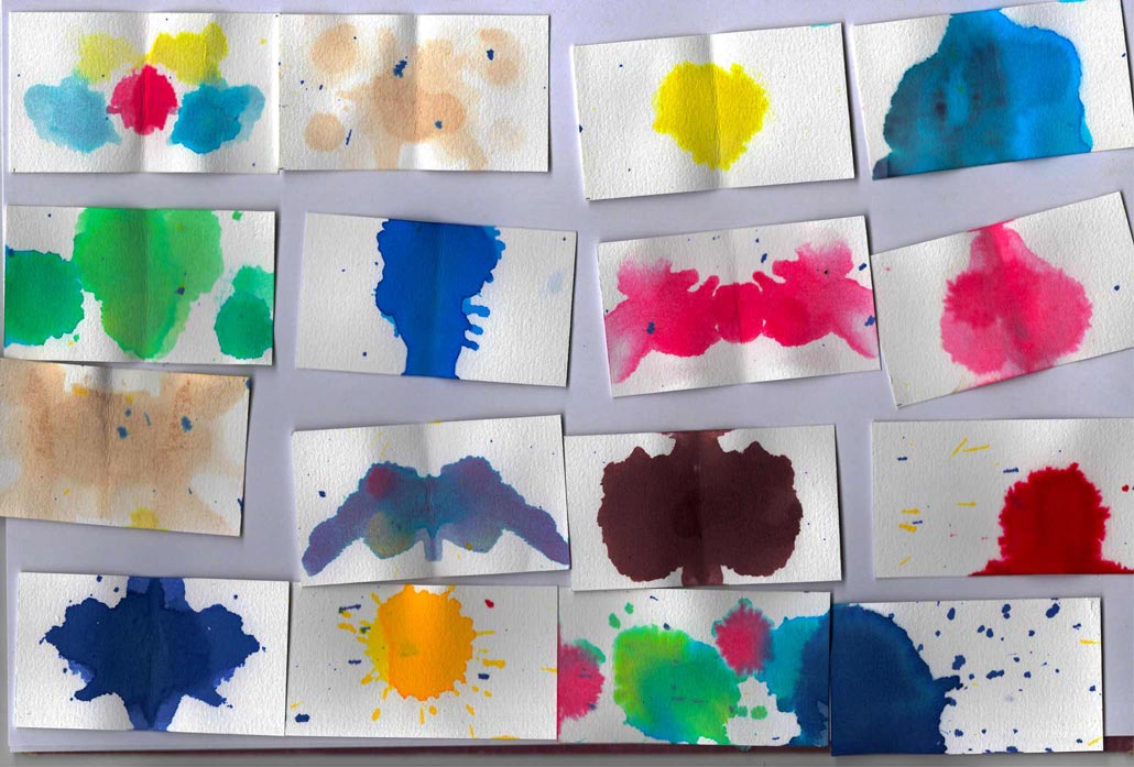 Pour commencer l’expérience, j’ai découpé et aligné des morceaux de papier qui me serviront de support. Ensuite, j’ai commencé à faire des tâches en utilisant un pinceau ou en versant directement des gouttes d’eau colorée et d’encre. J’ai finalement plié ces bouts de papier en deux afin de recréer cet effet de symétrie qu’on retrouve dans le test de Rorschach.